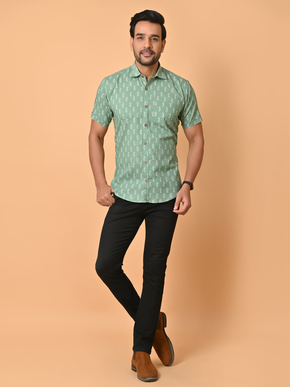 VJR Green Base White Floral Printed Shirt
